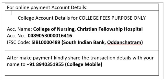 - Registration fee must be sent by a crossed demand draft only on any of the list of banks mentioned above in favor of “College of Nursing, Christian Fellowship Hospital”, Oddanchatram.