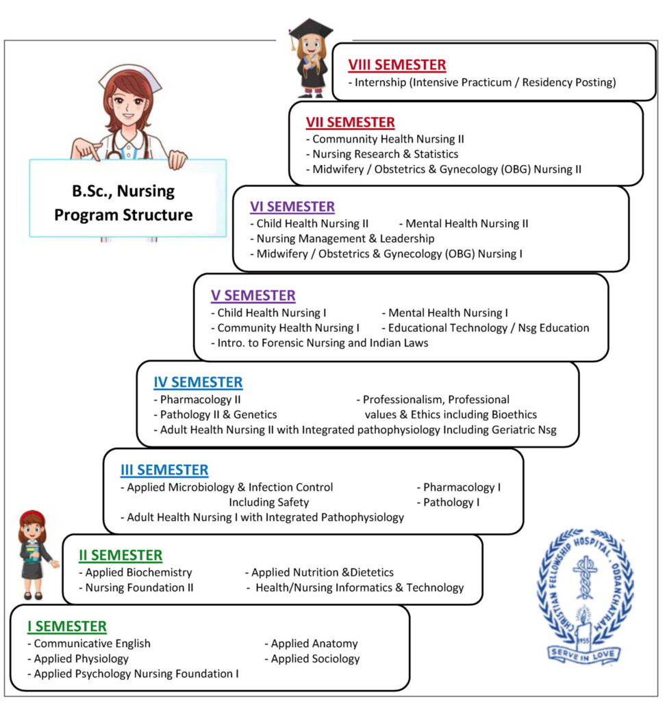 The B.Sc Nursing programme is a 4 year course designed to enable students to get wider understanding of nursing, based on scientific principles and clinical experience